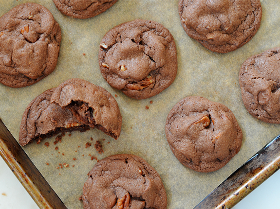 Baking chocolate chip cookies can be a crapshoot: sometimes they puff up nicely, other times they flatten out like pancakes. As a recipe developer, this drives me crazy! Thankfully, these double dose chocolate cookies are foolproof. Stuffed with chocolate chips and pecans, they emerge from the oven puffy, gooey, chewy and crunchy every single time. They are so rich and chocolatey, they almost beg for a tall glass of milk. Feel free to play with the recipe. You can dot the cookies with white chocolate chips for visual appeal, swap out the pecans for walnuts, or add dried cherries if you're a fruit and chocolate person. Or do like my daughter: sandwich two cookies together with a scoop of vanilla ice cream. Smart cookie ;) |