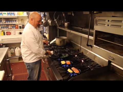 Wherever you're seated the menu features traditional meat and seafood dishes like Steak Diane and Sole Almondine, proof of five star chef Marc Dym's interest in classically prepared food, as well as a local wine list. I chose Chef Dym's Pine Nut-Crusted Salmon because it exemplifies why the dining at Little River Inn is considered a must see attraction along the Mendocino Coast. This elegant entree earns a flavor boost from its sweet basil coulis and savory pine nut crust. One bite and you'll see that its Mediterranean influence is strong, but made with local king salmon which is pure Mendocino. It's a simple preparation. Simple enough to be made at home, so I asked the chef for the recipe which he graciously provided. He also agreed to make this dish for a video (see below). GREG