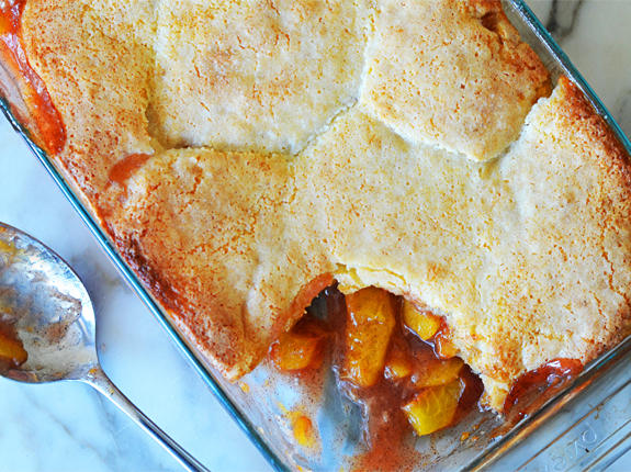 As I write this recipe post, I'm perched on a fallen tree trunk by the creek in my backyard, scribbling on a notepad and watching my daughter catch bluegills and crawfish. Admittedly, it took some cajoling to get me out here -- it's 95 degrees, the middle of a workday and fishing is so not my thing -- but now that I'm listening to the water roll over the rocks and seeing my girl happy and peaceful in her element, I'm realizing that I'll miss these relaxed summer afternoons when school starts next week. So, in the spirit of hanging onto every last bit of summer, I'm sharing my favorite Southern peach cobbler recipe this week. It's an easy dessert made from sweet yellow peaches, warm spices and a homemade buttermilk biscuit topping, baked until the fruit is bubbling and the topping is golden. The recipe is a great way to use up all those summer peaches, as well as any other fruit you'd like to mix in. Be sure to serve it with a scoop of vanilla ice cream or dollop of sweetened whipped cream on top. |
