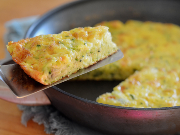 I always love the idea of a frittata. I mean, as long as you have a carton of eggs, you can throw one together in 30 minutes, and they're great for using up any leftover veggies, bits of meat or hunks of cheese you might have languishing in the fridge. Problem is, they're usually dry, tough and spongy--and just not that good. Whenever I have one, I find myself thinking that, for the same calories, I'd so much rather be eating quiche! So, this is my kind of frittata: delicate and creamy, almost like a crustless quiche. There are three secrets to success: 1) squeeze as much water as possible out of the zucchini; 2) add heavy cream and lots of cheese to the egg mixture; and 3) bake the frittata in the oven at a low temperature, instead of the traditional stovetop-to-broiler method, so the eggs cook gently into a custard without scrambling. |